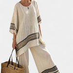 Uvolněný styl s nadčasovým námořnickým pocitem. Souprava Daisy upoutává pozornost v kombinaci kontrastních černých linií a přírodního pozadí, vyzařující uvolněnou eleganci. Její prostorná silueta a lehká tkanina ji činí dokonalým společníkem pro teplé klimatické podmínky a pomalé dny.
