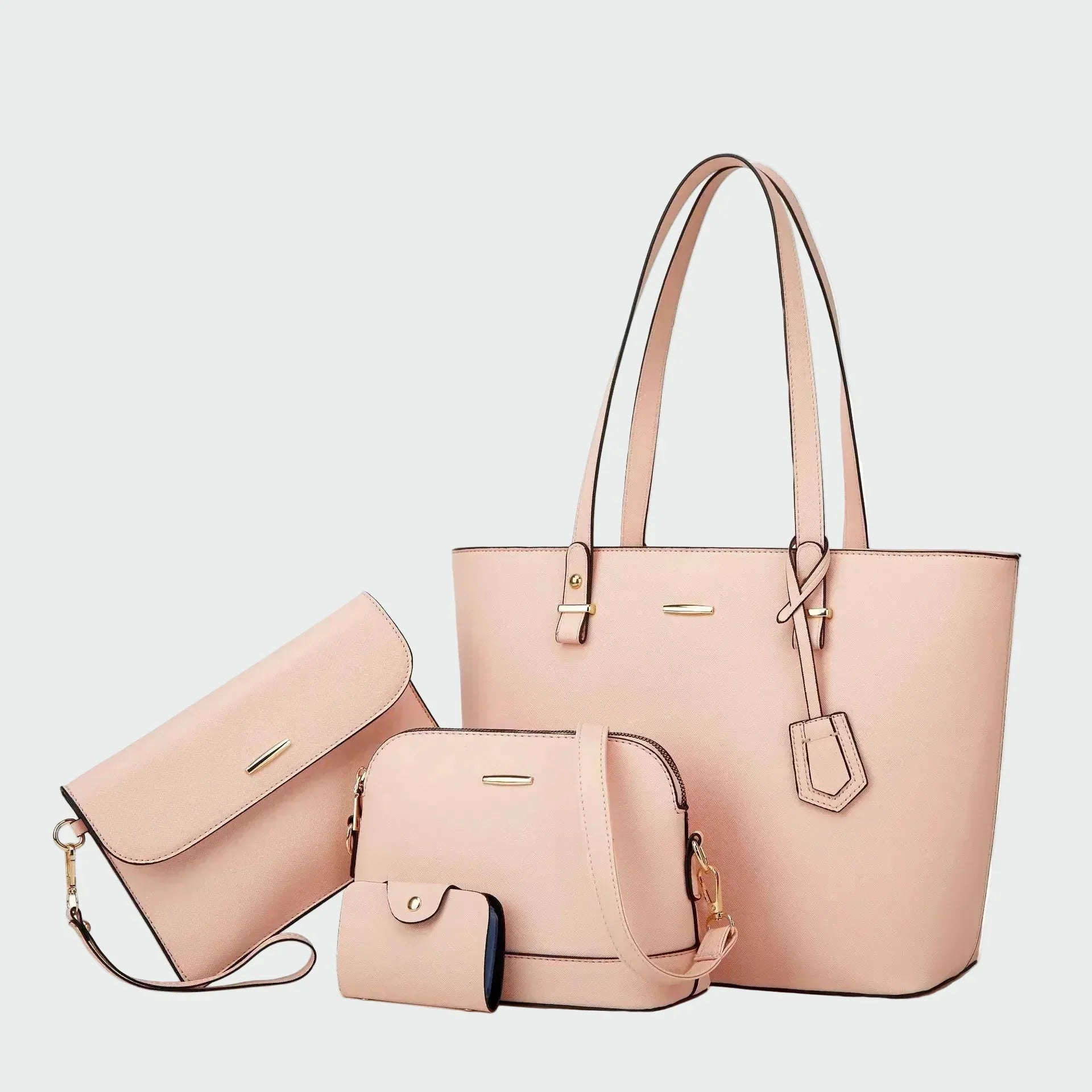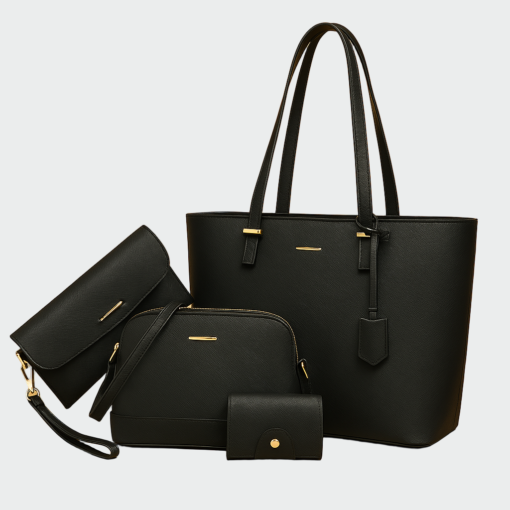 Sada tašek v černém odstínu, která kombinuje eleganci a praktičnost v každém detailu. Skládá se z velkých tašek přes rameno, menší křížové tašky, obálky a peněženky, vše s minimalistickým designem a zlatými detaily, které dodávají luxusní charakter. Prostorný interiér a více možností nošení ji činí ideální pro každodenní použití, ale i pro elegantní příležitosti. Kompletní sada, která pokryje všechny vaše potřeby se stylem.