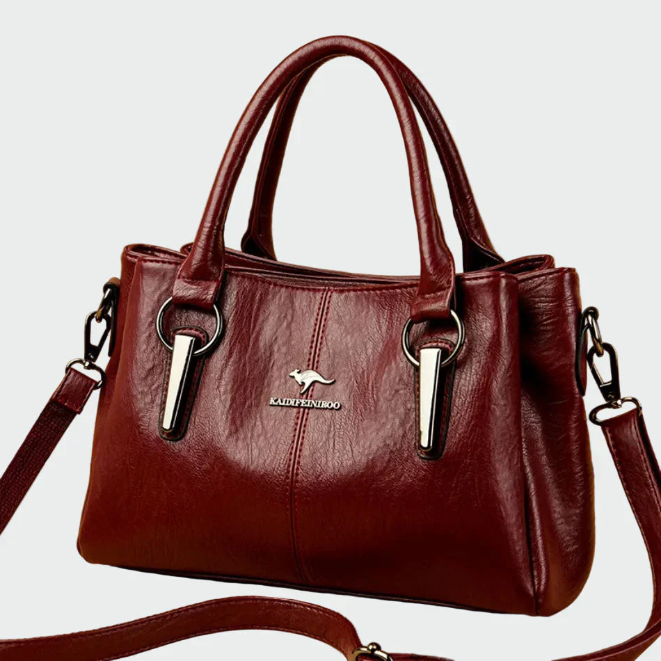 Elegantní lámská kabelka v bordó odstínu s nadčasovým designem, který vyzařuje jemnost. Disponuje odolnými uchy pro pohodlné držení a také odnímatelným ramenním popruhem pro větší pohodlí. Kovové detaily v stříbrném tónu dodávají moderní nádech, zatímco její praktická velikost je ideální pro každodenní použití, ale i pro elegantní příležitosti.