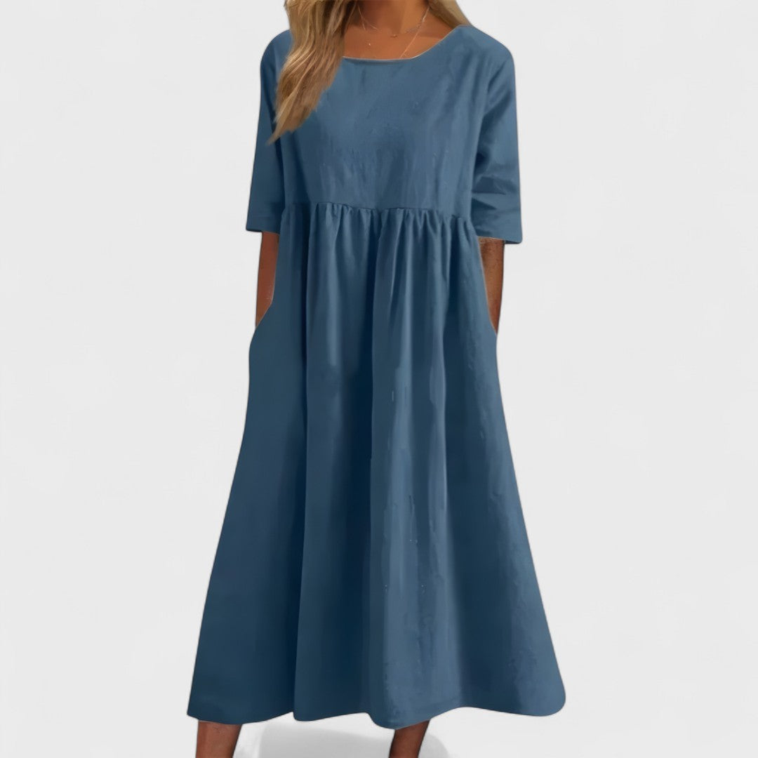 Šaty Sofia vynikají svým minimalistickým, přesto moderním designem. Vyrobené z kvalitní bavlněné směsi, která je jemná, prodyšná a příjemná k pokožce, ideální iv horkých dnech. Střih do áčka s volně padnoucí sukní přirozeně lichotí postavě, zatímco decentní výstřih dodává jemný ženský akcent. Jednoduchost modelu umožňuje snadné stylování – od sandálů po tenisky či doplňky.